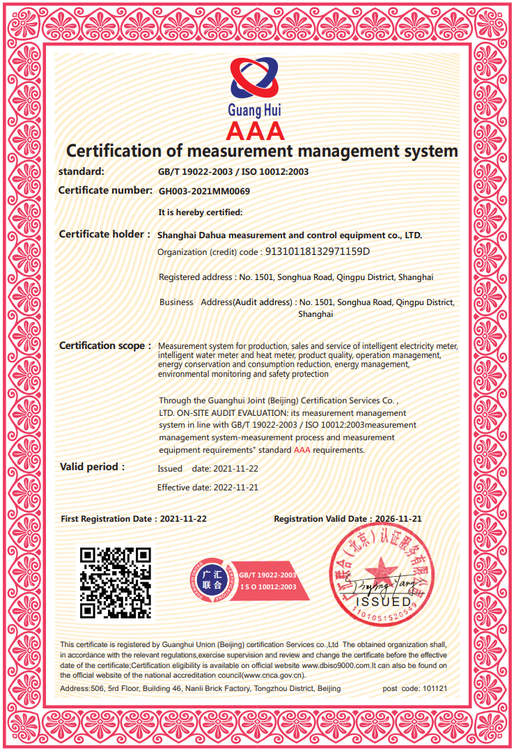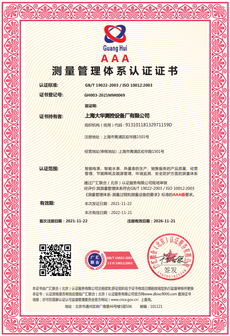 2020年 UCCS测量管理体系认证证书;